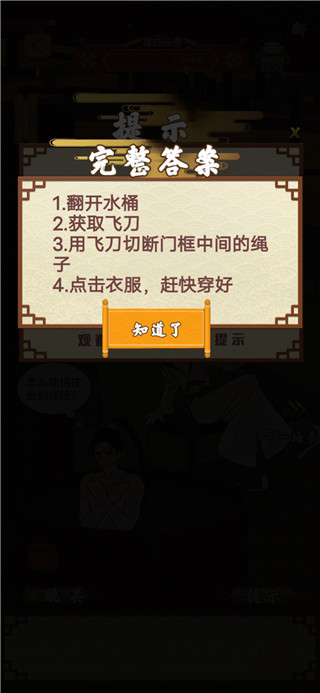 - 打开水瓢获取匕首,用匕首切断绿色绳子。进入下一场景点击衣服。