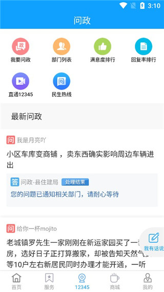 3、通过12345更是可以参与问政,解决一些生活问题,查看当地政府的办公直播;
