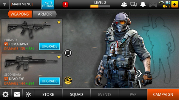 4、携带突击机枪、狙击枪、散弹枪、榴弹射器、火箭筒等枪械,及医药箱、盔甲和先进的电子设备奔赴前线 适用于触屏智能机的多样操控方式-既可点击屏幕中的虚拟按键以做出相应动作,也可以结合手势操作轻划屏幕。