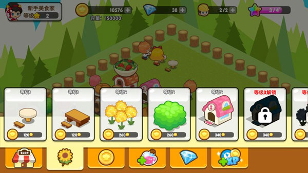 2、每一个建筑被建造完毕后并没有结束,还可以通过使用道具来增加其收入和魅力值以及金币的容量。道具可以通过点击美食屋中的宝箱购买到,不同的道具作用效果和能力都不同,还可以不断地解锁新的道具。另外,在左下角的萌妹子处还能够进行餐馆的扩充操作以及扩充美食促销展窗口操作。