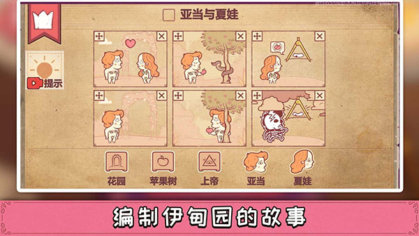 说书人游戏手机版是由Steam上很火的一款利用视觉语言元素编造故事的游戏——Storyteller移植而来,一般也被叫作彩色世界、讲故事的人。游戏中一共包含了爱与失去、哥特式悲伤和传说三个章节玩法,其中还会出现51个隐藏关卡,每一关都包含几种场景和若干角色,玩家将发挥自己的脑洞搭建不同的剧情,通过调整游戏角色的先后顺序,看他们之间如何前呼后应,再编造出一个切合给定标题的叙述故事。