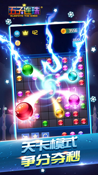 1、初级模式:小球有5种颜色,至少5个相同颜色的小球在一条直线上(横竖斜均可)即可消除得分。