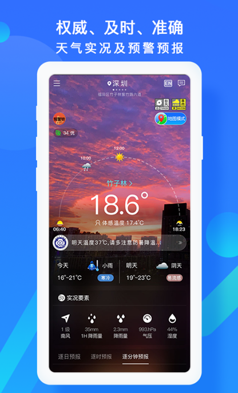 深圳天气app是由深圳市气象局官方推出的一款天气资讯平台,它能够为深圳人民提供最及时最准确的天气情况预报,是100万深圳人民的最佳天气app选择。深圳天气app拥有台风路径,雷达图像,卫星云图专业性产品、日出日落,往日实况等丰富多彩的全国性产品和地铁天气,分区预报,环境气象等精细产品,简直就是一款为市民量身定制的天气APP。你还能够通过深圳天气APP选择天气类型来拍摄实景天气,通过地图查看不同区域当前的天气状况,以此来为您的生活添加色彩,您还可以将您拍摄到的实景天气状况发布大实景模块,将最真实的天气状况分享出来。让每一天的天气都有仪式感。