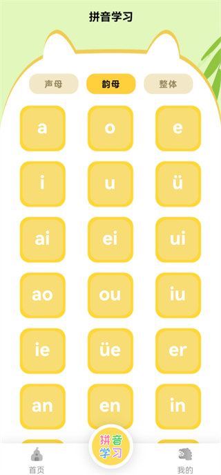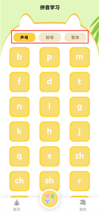 2、用户需要根据需求来选择声母、韵母和整体来进行学习;