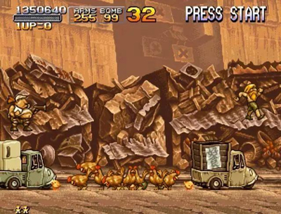 《合金弹头2金手指版》在游戏场景中,玩家不要破坏车辆,将所有的杂兵全部清理之后。将上面店铺打烂,其中就会飞出两只攻击。而这两只鸡刚好落在两车之间,飞不出去,跳不起来,这样就算是被关在里面了。