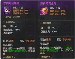 除了普通装备之外,还有额外的守护装备,可增加玩家打怪经验加成或减免伤害加成,实乃打怪升级和PK打boss的神器。