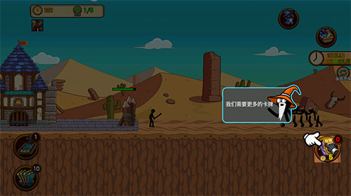 4、军事卡:军事卡顾名思义用于保卫家园,提升火柴人军事实力,军事卡可以反复使用,但是每次征召都要消耗金币和人口,而且军事卡必须安置在城墙处,随着游戏波数增加,你必须确保你的军事单位能够阻挡住潮水般的袭击。