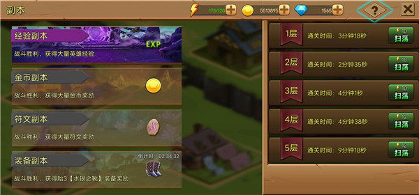 副本是消耗体力,获得经验、金币、符文的主要来源,可扫荡层数=vip等级
