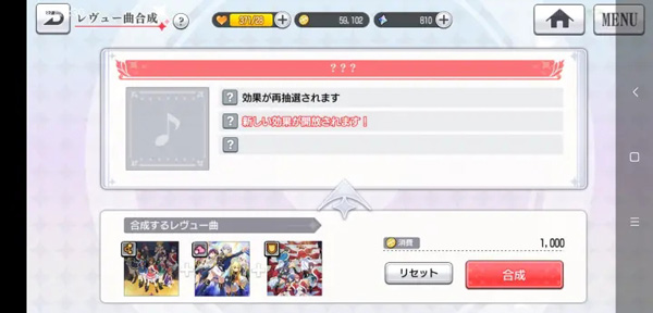 礼装的突破和升级没什么好说的和FGO差不多,而revue歌曲的属性需要说,虽然歌曲没有等级和星级,但每个歌曲的属性都是随机的,哪怕是相同的歌曲。每首歌曲最多可以有三个属性,但能够刷到的一般都自带一个属性,而玩家可以通过歌曲合成来将需要的属性整合到一首歌中。