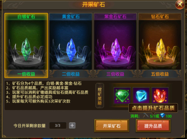 2、矿石分为4个品质,白银-黄金-紫金-钻石