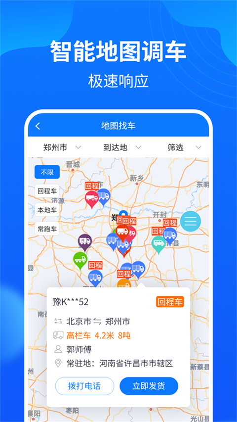 2、地图找车:通过地图找车功能快速调配全国回程车、常跑车;