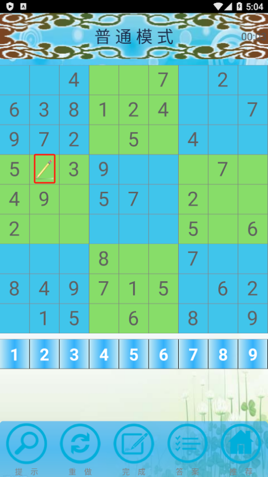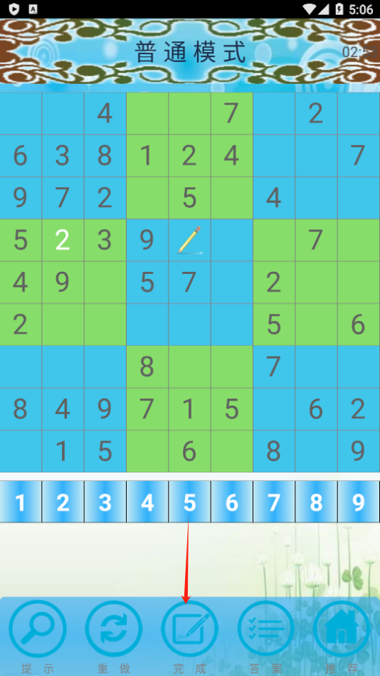 3、如果玩家不太确定格子里应该填什么数字,可以直接点击左下角的【提示】按钮,游戏会自动生成正确数字填入铅笔处。