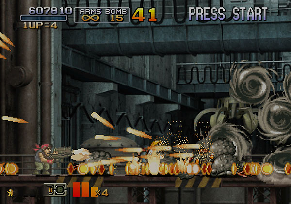 Rush Blast系统:从合金弹头6开始,主角下方会出现一个槽。随着打倒敌人,槽会不断扩充,最多可以攒到4个槽,每加一个槽打败敌人的分数会依次增加,依次为2、4、8、16倍。攒到4个之后,槽会开始慢慢减少,此时打死敌人后分数为16倍,并且敌人会不停地掉金币。使用不同的武器增加槽的速度有所差异