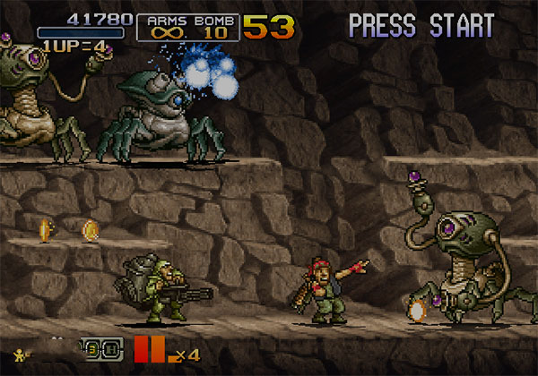 此场景出现的橄榄不会像前面的发射3段攻击,而是发射超大的橄榄弹,但是轨迹都是通过跑步可以躲过的(后面会出现一个轨迹不能通过跑步通过的橄榄)。当摧毁第二个橄榄后,会出现一名新的敌人:3只巨大的独眼鱼怪,它会向天空发射降落伞导弹(可以击毁),还会把你逼死在版面左边,所以要快速击毁(只有眼睛是弱点)。第一只是单枪匹马出现的,第二只还伴随3只ET,第三只伴随9只ET(打暴ET注意地上的自暴虫)。走到倒数第二层会出现前面提到的一个轨迹不能通过跑步通过的橄榄,它发射子弹后,要跳到此处的台阶上看准时机跳过,建议最好快速解决,否则援军飞碟会将上面的一个人质释放,此人质一但着地就救不到了。此场景有4块地方有隐藏的骨头,分别位于打完大独眼怪后版面上移后最右侧平台上方,第二次版面上移后人质上方和第三次版面上移后的人质上方。全部打出三个隐藏点才能打第四个隐藏点——在最后一次版面上移后立即左跳出大S,或者在最后一次版面上移后立即左移下降到最左边,然后稍微右移往左跳并出大R可击中隐藏点掉出骨头(当然一般吃不到),打出全部四个隐藏点后在最后一个机器人处会出现给Bullet的人质。进入小boss战,在类似光头将军的战场上对决洗脑同伴(因为多次失败,光头下岗了),此boss的攻击方式和你一样,出刀比3代的复制人快很多,但还算好对付,但此boss的难度是他的机枪,跳起发射6向机枪,暴走后还会发射多发机枪,很难躲;RP差的时候还会近身发射机枪。建议攒大S或Z然后得到Bullet加弹药后迅速消灭。这时。解救洗脑同伴后会出现金色的METAL SLUG(如果长时间不乘坐,在下层会出现500000的奖分,并且强制过关)。