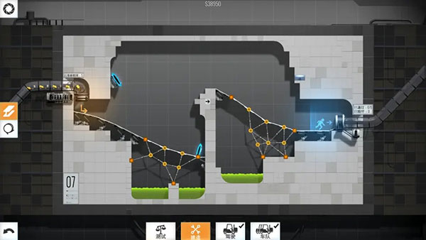 斜坡。这一关用到了三角形稳定结构,先铺设上一层桥面,然后点击桥面进行硬化,在桥面的下方,搭设三角形结构进行支撑,即可通关。