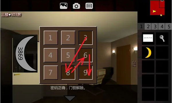 7、回到3F•西侧廊,取走密码器上的【粉色碎片】。回到 1F•大堂。右转2次,用【3号钥匙】打开3号门,进入1F•东侧廊。左转3次,上楼,进入2F•东侧廊。右转3次,取走花盆旁的【橙色碎片】。左转3次,下楼,进入1F•东侧廊。右转3次,点击密码器,原理是井字棋,你为先手,只要正确3个一组连线即可解锁。