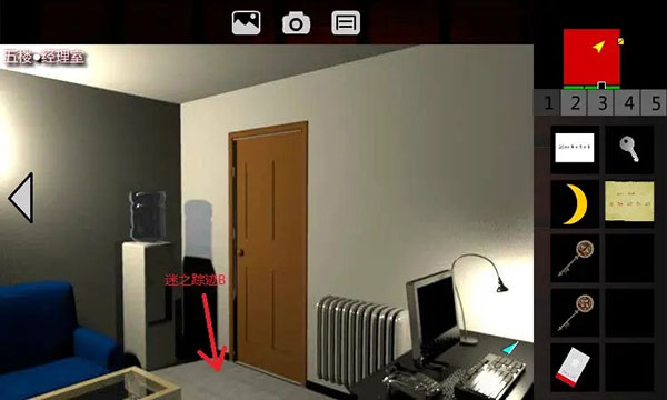 3、左转,点击柜台内侧,取走【纸团】。左转,取走柜台中间的【1号钥匙】。左转,出门。