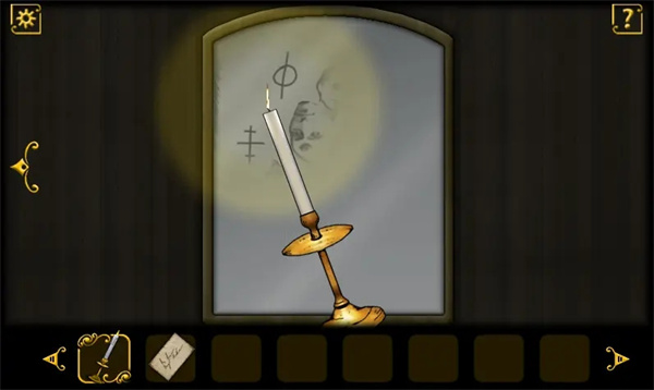 2、往里深入,看到墙上的地图和小圆几上的蜡烛台。旁边墙上有个谜题。继续往里,进入左边门中,梳妆台的镜子上夹着一张纸片,上面写着:光明总能揭露真相。用钥匙打开梳妆台的柜门,按下右面红色按钮,会发现变换的字母和与之相对应的图形。屋中右边的柜子上似乎缺少了什么。