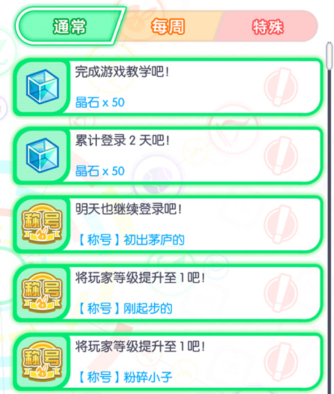 点击主界面的任务即可进入任务菜单,通过达成任务能获得大量素材,晶石等资源。每周任务会根据每周刷新,完成冒险每周也能获取丰富的奖励。特殊任务会在特定时候开放