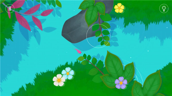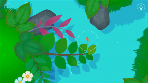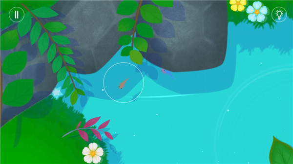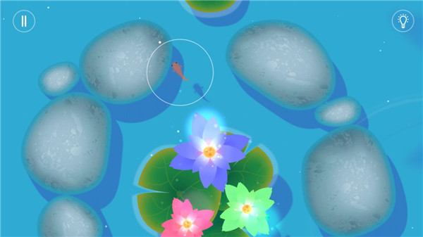 游戏的操作也非常简单,只要在屏幕上点击或滑动就可以控制小鲤鱼行动。当我们带领这其他小鱼找到对应颜色的花朵旁边时,只要点击一下花朵上方的白色按钮即可让花朵绽放。
