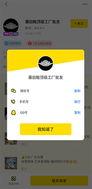 平台提供专业的货源商家信息,用户可于商家店铺主页或产品动态页添加商家联系方式,自行与商家沟通批量拿货及代理事宜。