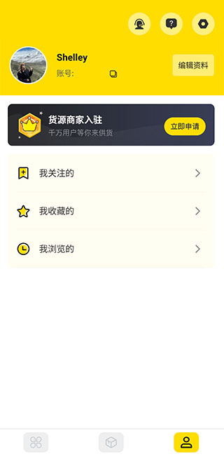 6、底部最后是个人中心,可以查看自己已关注、已收藏以及浏览记录,还可以申请入驻商家。