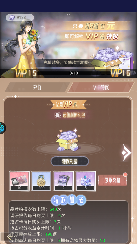 5、上线就送VIP15特权加成以及奖励,不要忘了VIP15等级之前的特权奖励都可以可以领取!