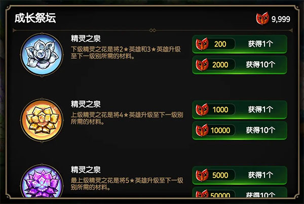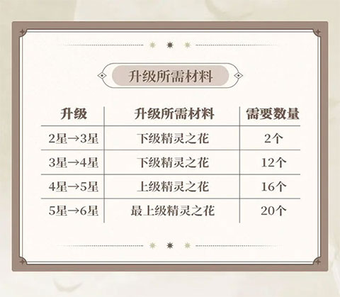 不同级别的精灵之花可为对应星级的英雄提升星级以及等级上限,届时需要消耗一定数量的精灵之花。
