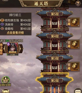 1、整10层额外领取一份通关奖励每一层首次挑战不消耗次数,已通关层可进行扫荡
