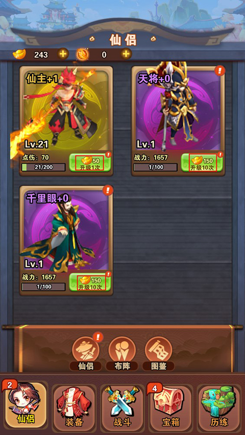 5、游戏内神将和主角都可以进行升级提升,需要注意的是,神将等级和主角齐平,无法超过,玩家要先提升主角等级才能更多的提升神将等级。