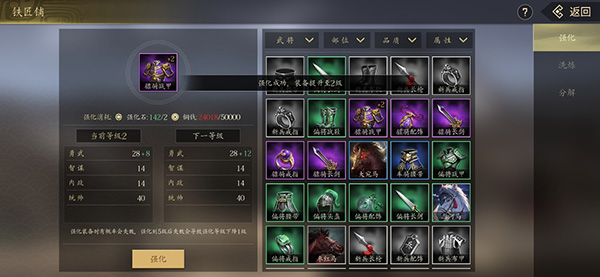 玩家可以将自己所拥有的装备在铁匠铺内进行强化,强化以后会获得强化属性。强化时需要消耗强化石和铜币,强化石可以通过商城购买、战斗掉落以及参与活动获得。