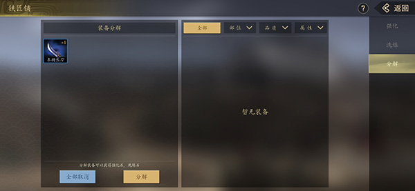 玩家可以将自己闲置未穿戴的装备进行分解,分解以后可以获得强化石和洗练石。装备品质越高,分解获得的强化石和洗练石越多。分解的强化石和洗练石可以用来强化装备和进行装备洗炼。