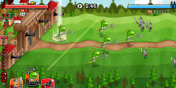 采用的是横向的战场模式,敌我双方城堡排在左右两边,战场上分布了3个可反复争夺的出生点,每攻陷一个都可以将兵线前推。每次战斗玩家都可以随机选择8个可用兵种单位都,根据不同的点数消耗与数量限制玩家可以选择不同的战斗策略。