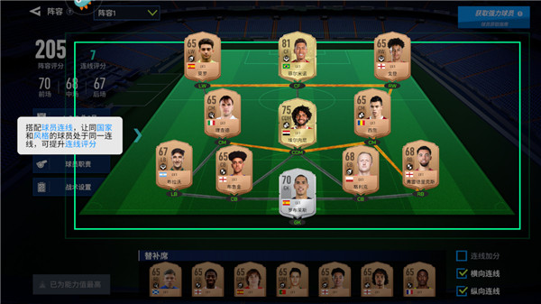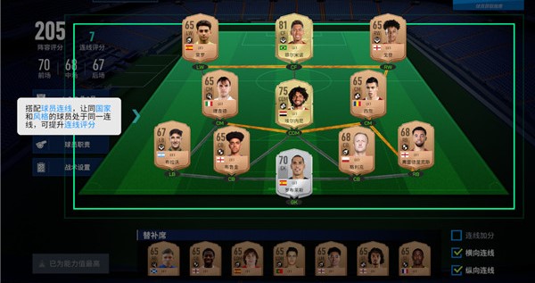 3、玩家可以通过搭配球员连线,让同国家和风格的球员处于一连线,提升连线评分。