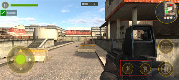 8、射击按钮旁边还有两个按钮,一个是跳跃,另一个是下蹲,跳跃可以帮助玩家越过一些障碍,当发现敌人可以点击下蹲来靠近;