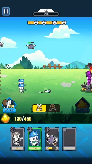 从游戏的名字中就可以知道这是一款魔性的玩梗游戏,在玩梗的基础上其实玩法做的也不差。游戏中玩家需要操控矿工去挖矿,将矿物用来养兵,利用养出来的兵防守或者进攻,直到摧毁敌方的防御塔为胜利,己方防御塔被摧毁则失败。