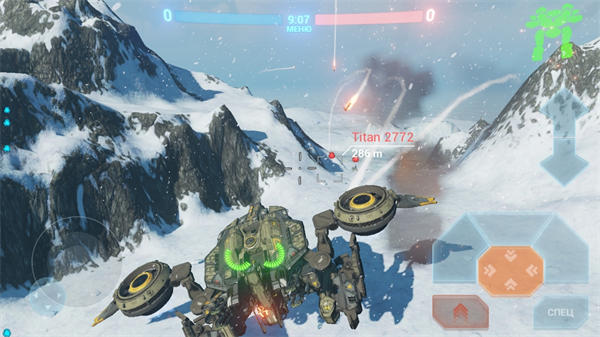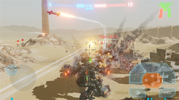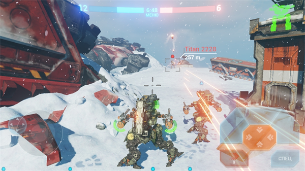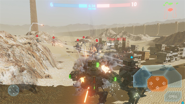 游戏为6v6的pvp模式(实际上人机占多数),现在有雪地沙漠两幅地图,在地图上操作机甲击杀对面得分,击杀完对方或者时间到计算双方分数结算比赛,机甲有轻型中性重型三类,其中各有好几种机甲,各个机甲总得来说特点鲜明,优劣势也十分明显,好像还有飞机,不过没找到购买方式