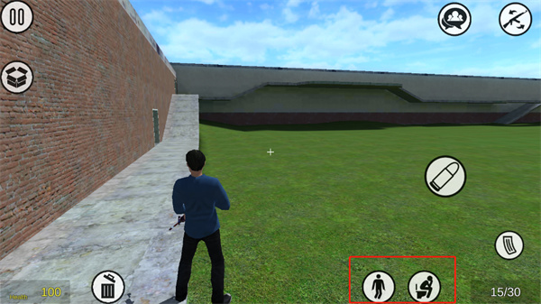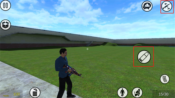 4、点击右上角的按钮来切换武器,按住子弹按钮进行攻击;