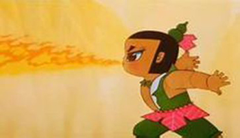 四娃出生,便用火焰帮爷爷做饭烧水。随后四娃喷火烧死周围的毒虫毒蛇,修复被妖怪破坏的环境。