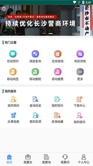 长沙不动产app是一款方便长沙市民办理业务的软件,拥有非常丰富的服务功能,通过它用户可以进行线上登记预约,在线查档,买卖房屋管理,移动缴税和缴费等服务,在办理业务的大厅中分为预约查询、线上业务、缴费缴税、办事指南四个板块,让用户可以清楚的看到各个板块中的具体相关业务。同时带给用户简洁的美观,在用户办理业务的同时尽可能减少网签业务风险,最终做到服务为民、服务于民的目的。除此之外,用户在进行房产登记时,长沙不动产登记中心app内提供的网上签约加上移动网签的快捷服务,相较于传统的手续办理来说绝对要方便许多,让买房变得更加方便轻松,还利用电子签名技术保障电子信息的真实性和完整性以及签名人的不可否认性,大大提高了不动产登记的信息安全。