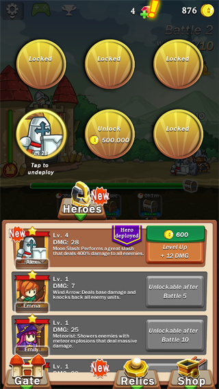 英雄默认的攻速很慢,不过我们可以点击来让其攻击,可以看做是点击类游戏里的点击伤害,是我们可以控制的攻击,英雄只能攻击地面怪物。英雄的区别主要在于技能,分为伤害型技能和妨害型技能。伤害型技能通常是AOE,清理BOSS战时的小怪,妨害型技能可以限制怪物的行动,用来牵制BOSS级怪物。英雄可以通过钻石购买,达到一定关卡也可以获得,这里建议大家先配置满三个英雄,可以方便达成一些成就,三个英雄在前期也能比较轻松的防守住进攻。