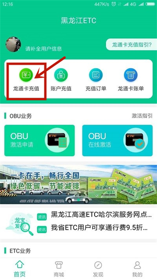 1、在主界面,我们点击“龙通卡充值”或者“账户充值”。