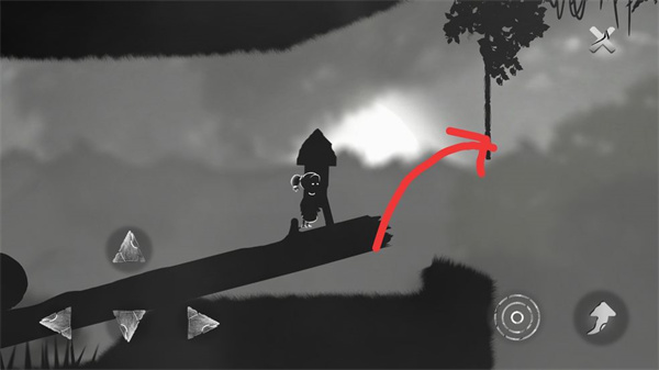 ⑨、将刚才落地的小球向右推至木头上。使女孩站在倾斜的木条上跳跃抓住右上方的藤条