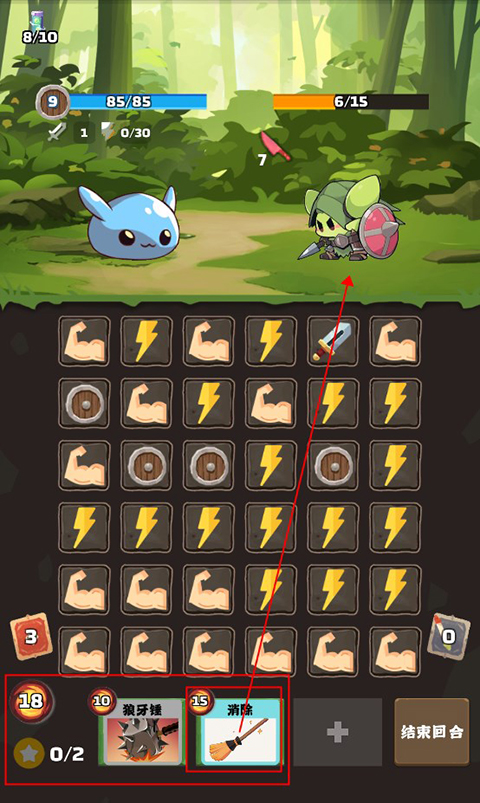 玩家在消除元素格子时可以获得能量,使用卡牌需要消耗能量,直接拖动卡牌到上方即可使用。
