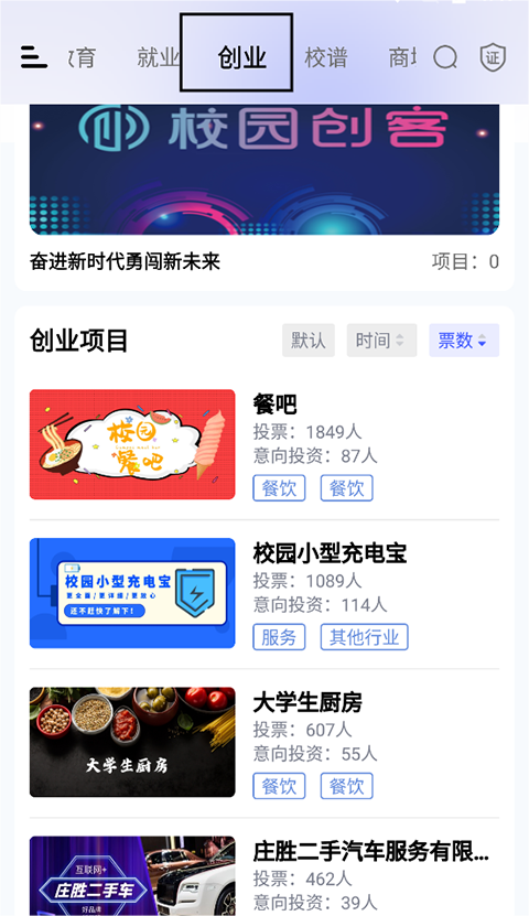 1、在首页选择创业栏目,就能看到一些正在进行的创业项目