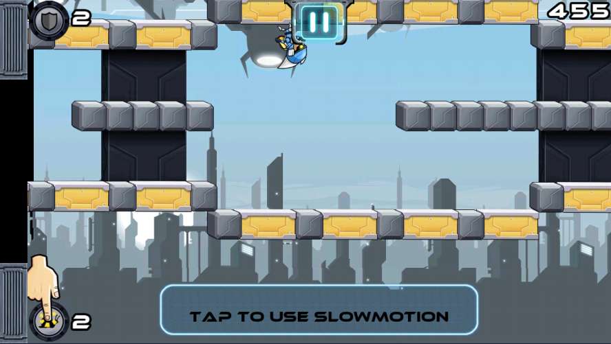 3、游戏类型有点像反重力跑酷。屏幕左下角有一个按钮,这个按钮可以放慢时间和空间,我们就比较不容易出错。