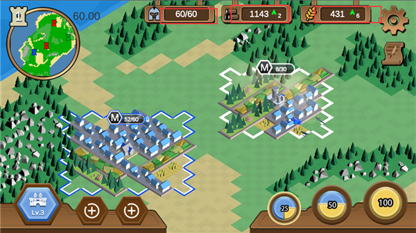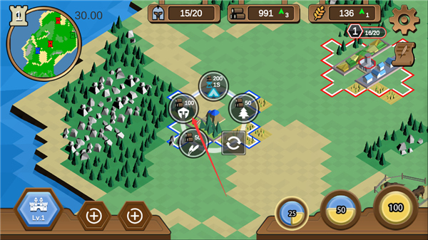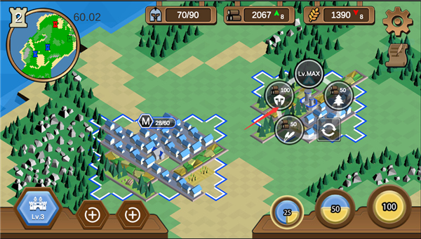 建造伐木场、农田、兵营,获得木材、粮食、士兵数,木材用于建造升级,粮食用于产出士兵,兵营用于训练士兵,所以这就需要玩家在这三种建筑和资源中相互权衡,以此达到最优的策略方针。