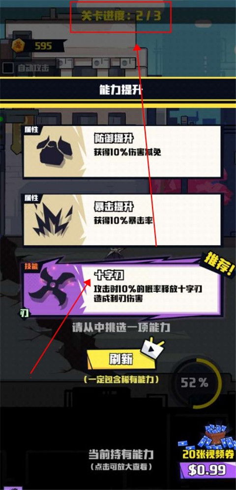 3、游戏正上方有关卡进度,每次清理一片区域后都会获得能力提升,我们可以在三项选择中任选一项,以便我们可以更好的击杀后续的敌人们