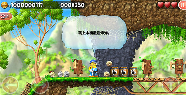 1、左边的两个按键分别控制前进和后退,右边的按键控制跳跃,按两下则是二段跳,杰克有3颗爱心,碰到虫子等怪物会消耗爱心;