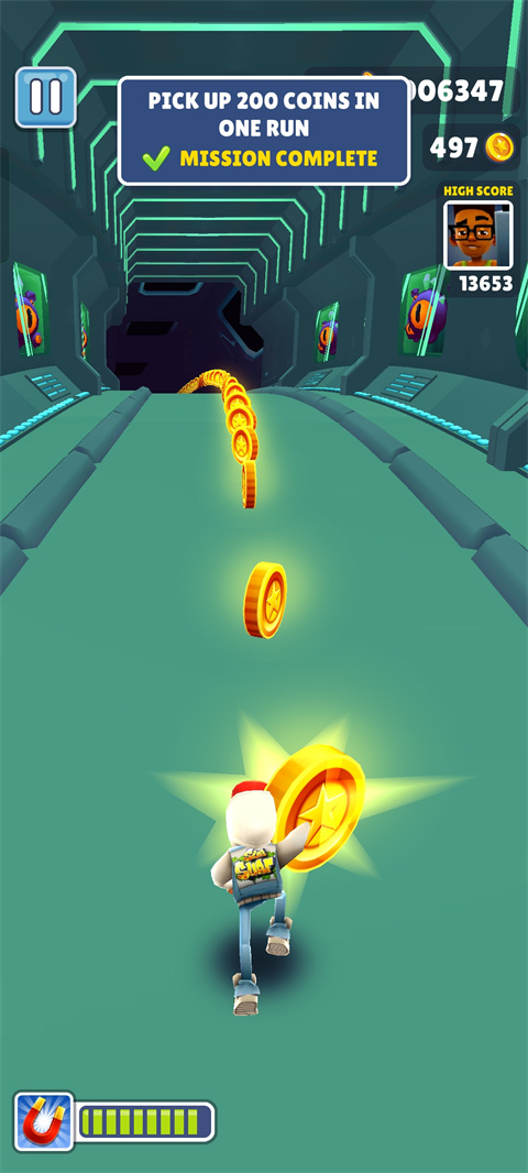 7、同时我们也要不断收集金币以及其他的道具,比如磁铁、喷气背包等,捡到磁铁可以收集路两边的金币,捡到喷气背包后角色会进入空中的电缆上飞行,不会有任何障碍,同时也有大量金币;